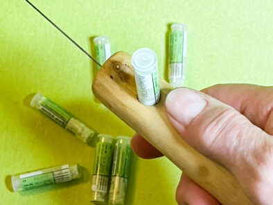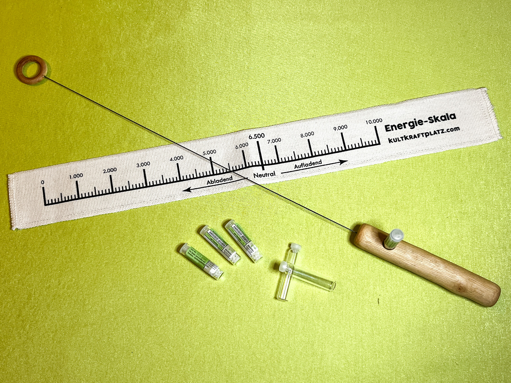 Fülle eine kleine Menge der gewünschten Substanz in ein sauberes Probenröhrchen und stecke es in die Öffnung im Griff. Nun kannst du austesten, ob diese Substanz aktuell in harmonischer Beziehung zur Testperson steht oder – beim selektivem Suchen – wo die Substanz im Umfeld zu finden ist.