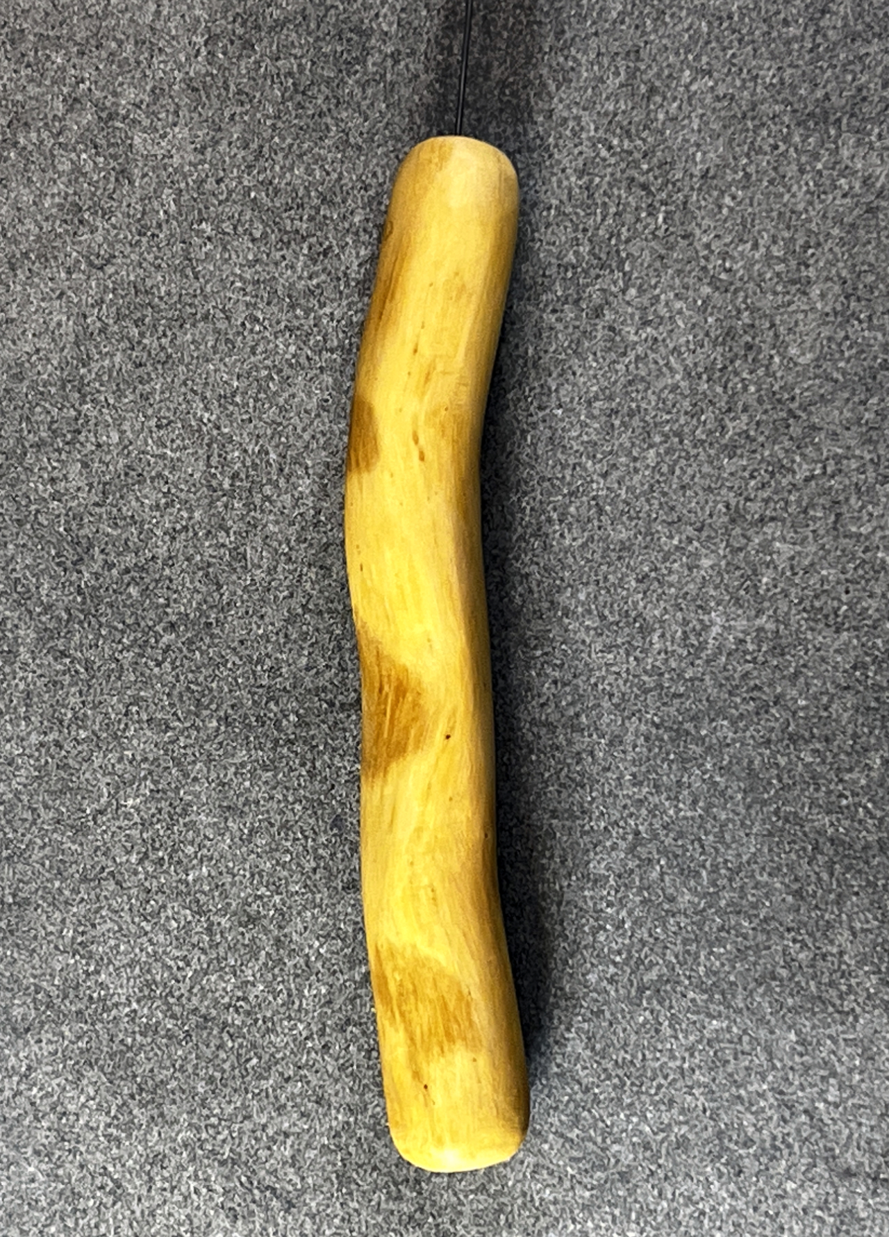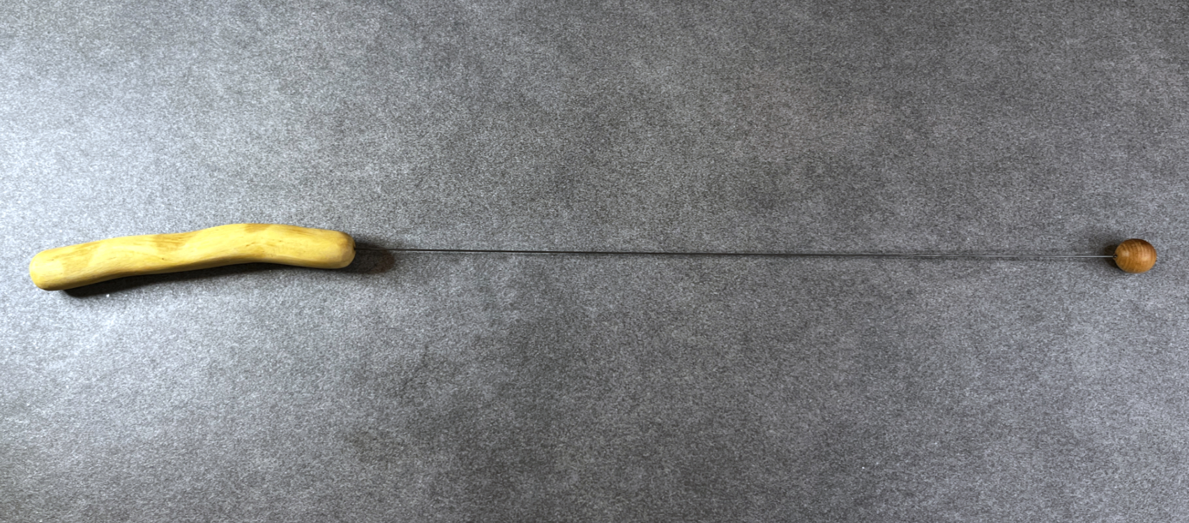 Einhandrute (Tensor) mit individuellem Griff aus Efeu, von Hand geschliffen und mit Leinöl, sowie einer Mischung aus Bienen- und Carnaubawachs hell gewachst. Dieses Holz stammt von einem großen Efeustrauch, der im Zuge von Waldarbeiten am Rande des Steinfeldes (Niederösterreich) geschnitten wurde. Die Verarbeitung erfolgte so, dass die natürliche Form des Holzes beibehalten und gezielt herausgearbeitet wurde, was in diesem Fall zu einem „ergonomischen“ weil leicht geschwungenen Griff geführt hat, der sich gut in die Hand schmiegt.