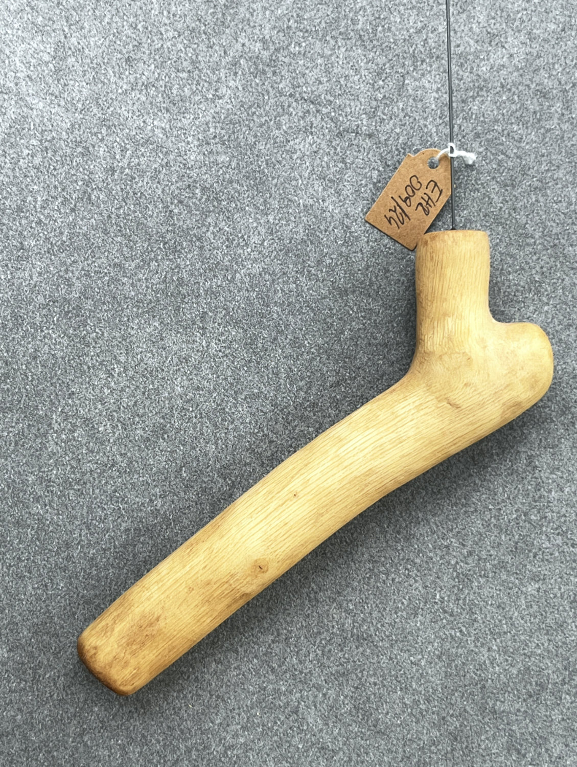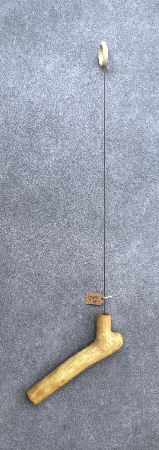 Einhandrute (Tensor) mit individuellem Griff aus Rosenholz, von Hand geschliffen, mit einer Mischung aus Bienenwachs und Kokosöl dunkel gewachst. Das Holz stammt von einer alten, weißen Kletterrose aus unserem Garten und liegt sehr angenehm in der Hand, wie alle unsere Ruten. Die Verarbeitung erfolgte so, dass die natürliche Form des Astholzes so weit als möglich beibehalten wurde – hier hat sich eine abgewinkelte, ergonomische Form ergeben, die ansonsten sehr glatt gehalten wurde. Der Griff schmiegt sich gut in die Hand, die abgewinkelte Form sorgt dafür, dass das Handgelenk sehr entspannt gehalten wird.