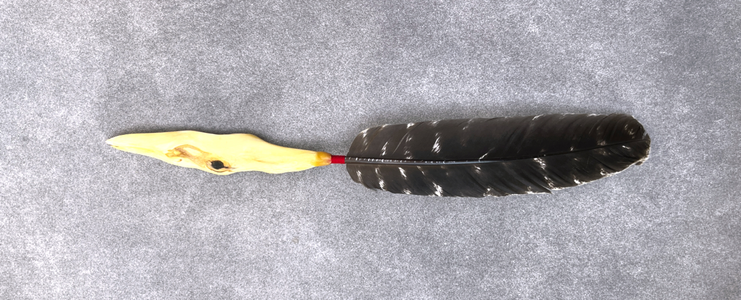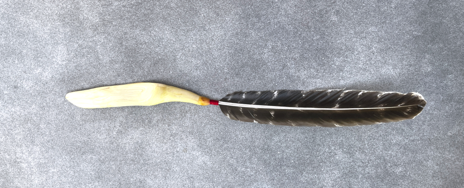 Räucherfeder mit handgefertigtem Holzgriff aus einer Mammutbaumwurzel (Sequoia) und einer Bio-Truthahnfeder.