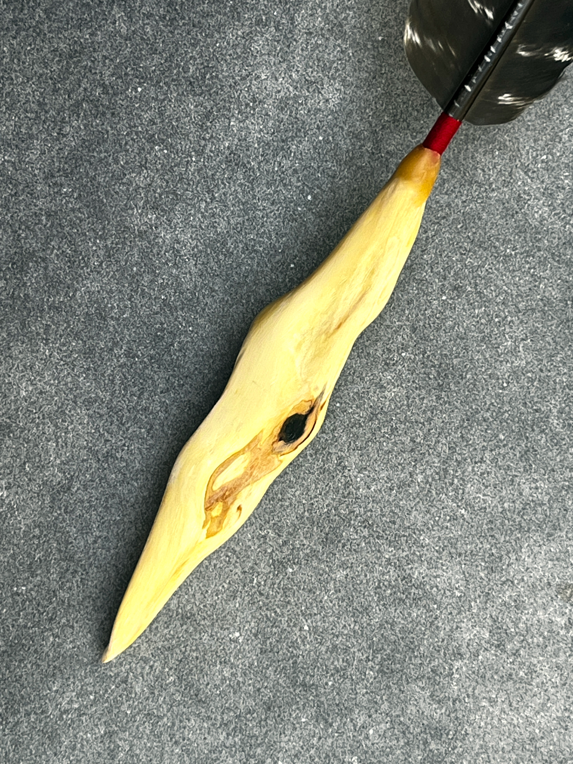 Der geomantische Zusammenbau erfolgt derart, dass man die Feder auch austauschen kann. Sie sind nicht mit dem Griff verklebt, sondern fest eingeklemmt und mit Bienenwachs versiegelt. Somit kann die Feder, falls sie einmal zu Schaden kommt, auch einfach selbst ausgetauscht werden. Zugleich ist der Zusammenhalt robust genug für den angedachten Einsatzzweck.