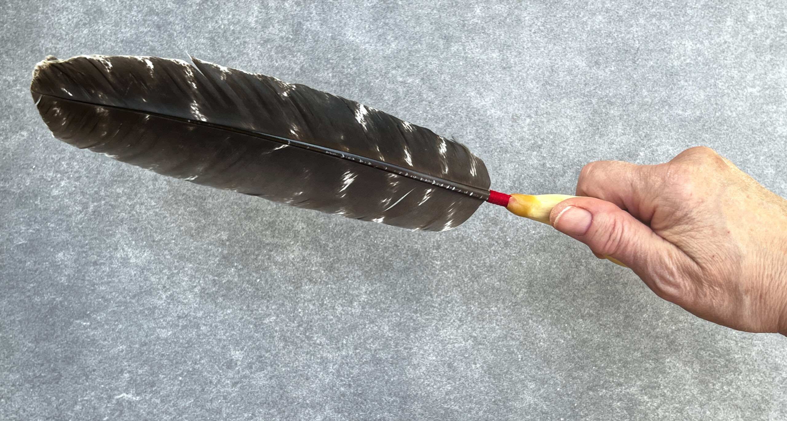 Der Federkiel ist bis zum Beginn der eigentlichen Feder mit einem Baumwollfaden umwickelt, bei diesem Modell hier in rot. Die Farben wurden geomantisch zu den Griffen und Federn ausgewählt, so dass sich eine energetisch harmonische Verbindung ergibt. Jede Räucherfeder ist somit ein außergewöhnliches Einzelstück und liegt zudem angenehm in der Hand – eine wertvolle Unterstützung beim Räuchern und für energetische Arbeiten.