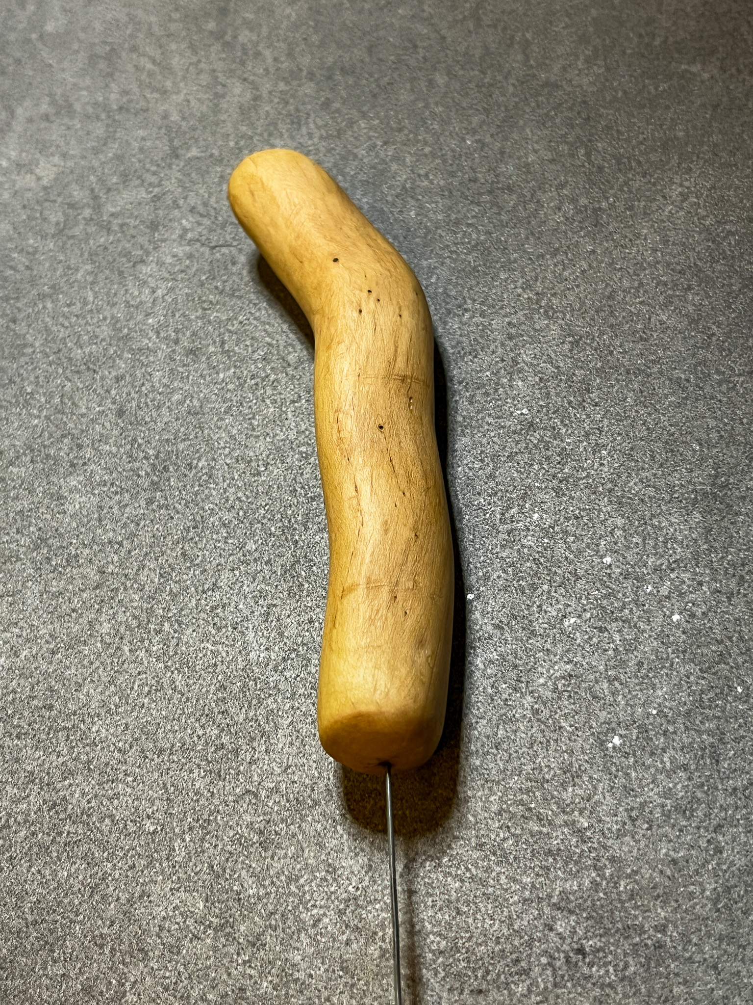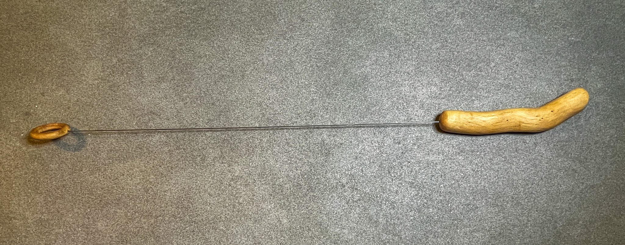 Diese Einhandrute (Tensor) hat einen schmalen Griff aus Efeu, sorgfältig von Hand geschliffen und mit einer dunklen Wachsmischung aus Bienenwachs und Kokosöl behandelt. Das schützt das Holz vor Austrocknung und erzeugt eine warme, lebendige Oberfläche. Das Holz des uralten Efeus stammt aus einem Privatgarten am Rande des Steinfelds, in Niederösterreich. Die leichte Wellenform der Efeuwurzel wurde bewusst in den Griff integriert und sorgt für eine angenehme Griffform.
