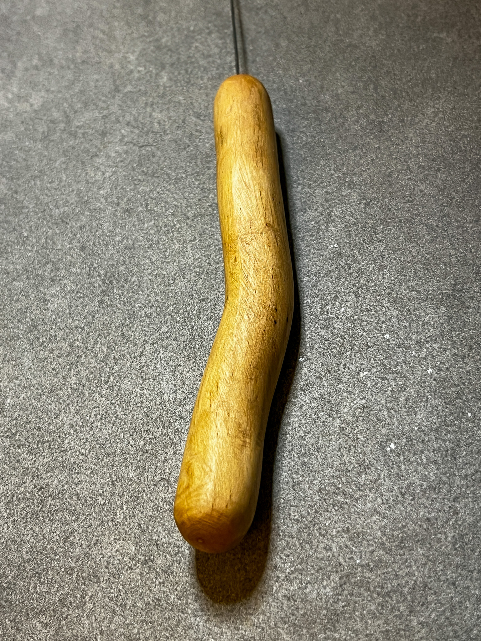 Dieser Tensor besitzt einen schmalen Griff aus Efeu, sorgfältig geschliffen und mit einem natürlichen Wachs aus Bienenwachs und Kokosöl behandelt. Das schützt das Holz vor Austrocknung und erzeugt eine warme, lebendige Oberfläche. Das Holz dieses uralten Efeus stammt aus einem Privatgarten am Rande des Steinfelds, in Niederösterreich. Die leicht gebogene Form der Efeuwurzel wurde bewusst in den Griff integriert und gibt ihm so eine angenehme Form. Das dunkle Wachs hat die Holzmaserung hervorgebracht, was dem schlichten Griff seine Besonderheit gibt.