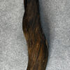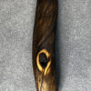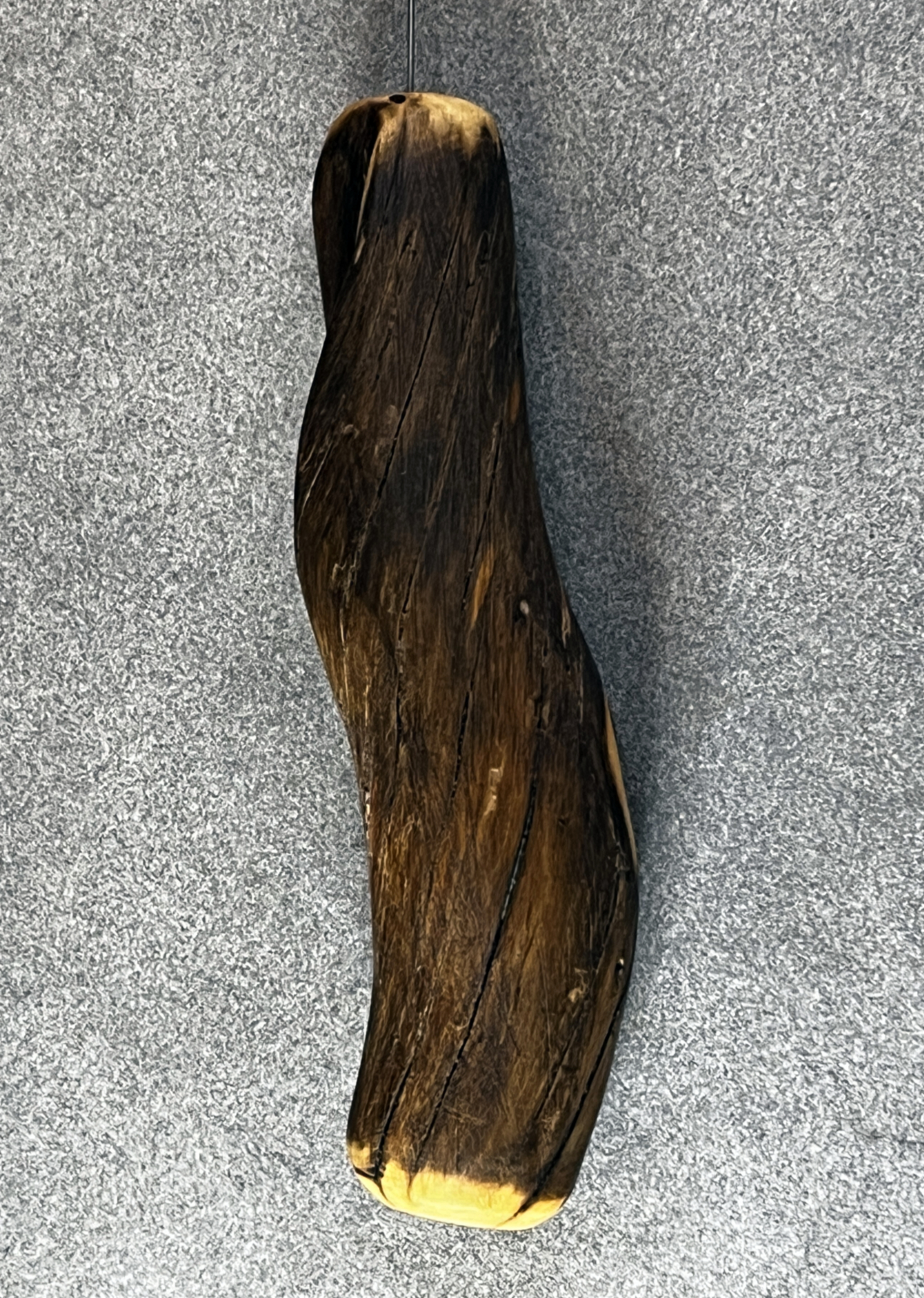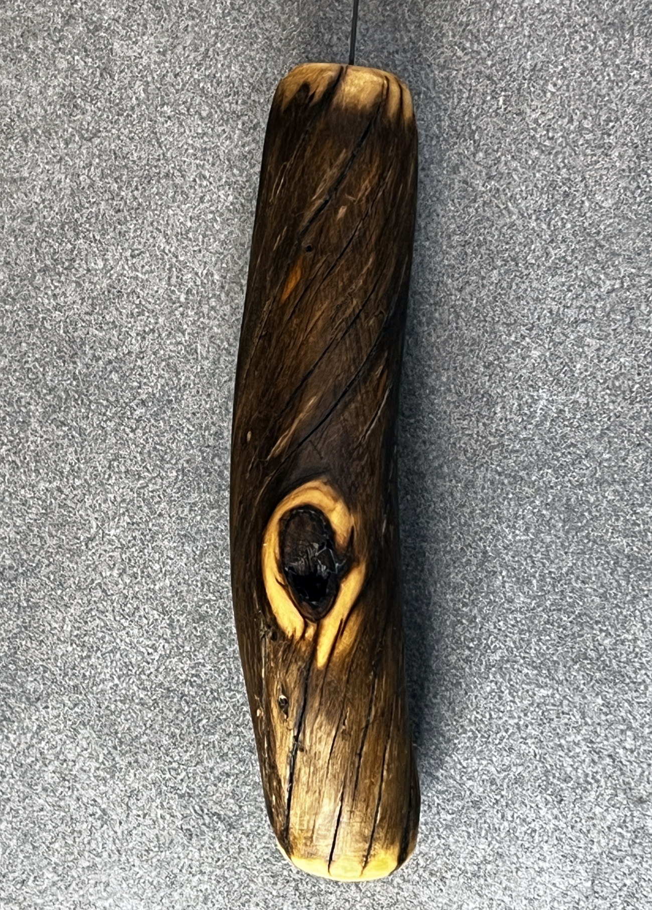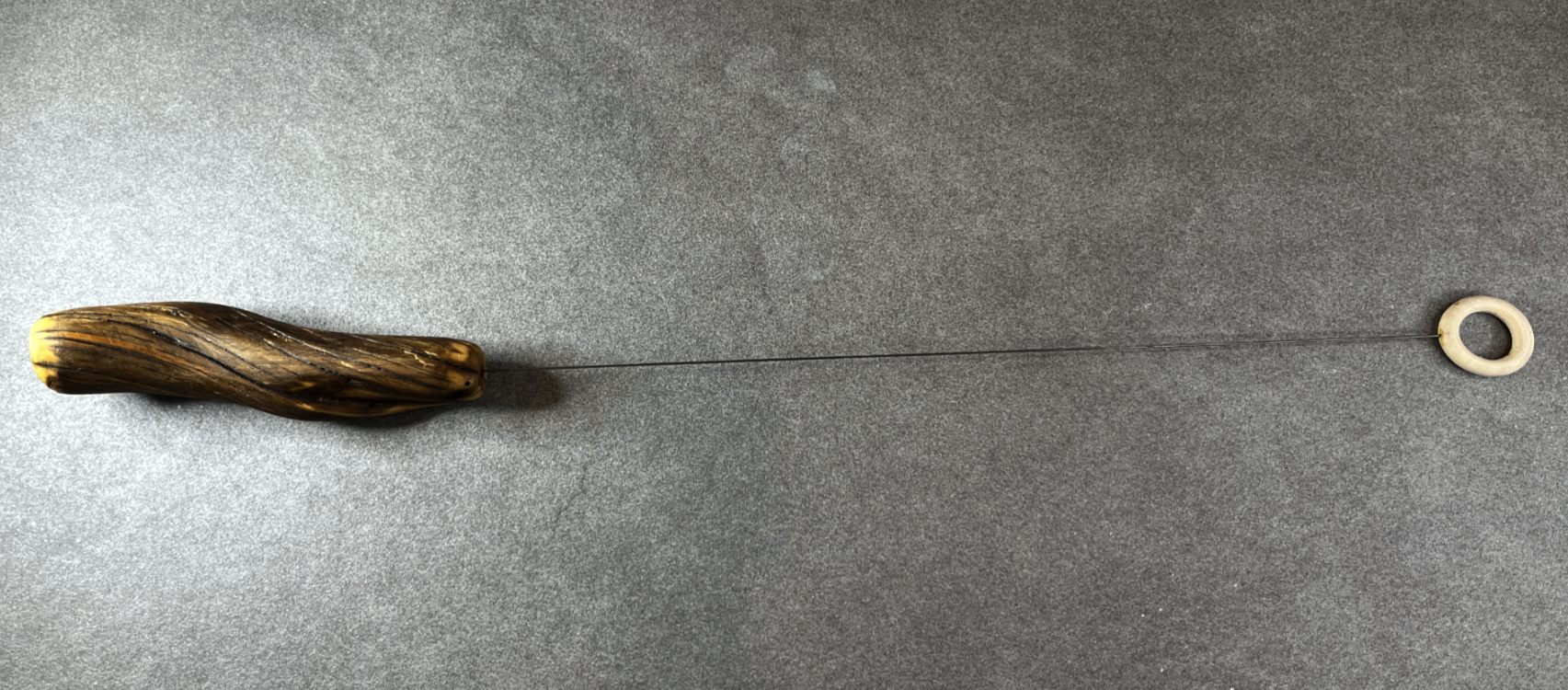 Der Griff für diese Einhandrute ist leicht S-förmig gebogen und liegt angenehm, ergonomisch in der Hand. Das Holz stammt vom gedreht gewachsenen Ast eines Nadelbaumes, einem besonderen Fundstück aus den Tiroler Bergen. Es wurde sorgfältig geschliffen, um die gedrehte Struktur, den Schwung des Astes und die anderen Besonderheiten achtsam herauszuarbeiten. Im Anschluss wurde es mit reinem Leinöl und einer hellen Mischung aus Bienen- und Carnaubawachs behandelt – biologisch und lebensmittelecht. Diese Behandlung schützt das Holz, betont die Maserung und schafft eine matte, widerstandsfähige Struktur.