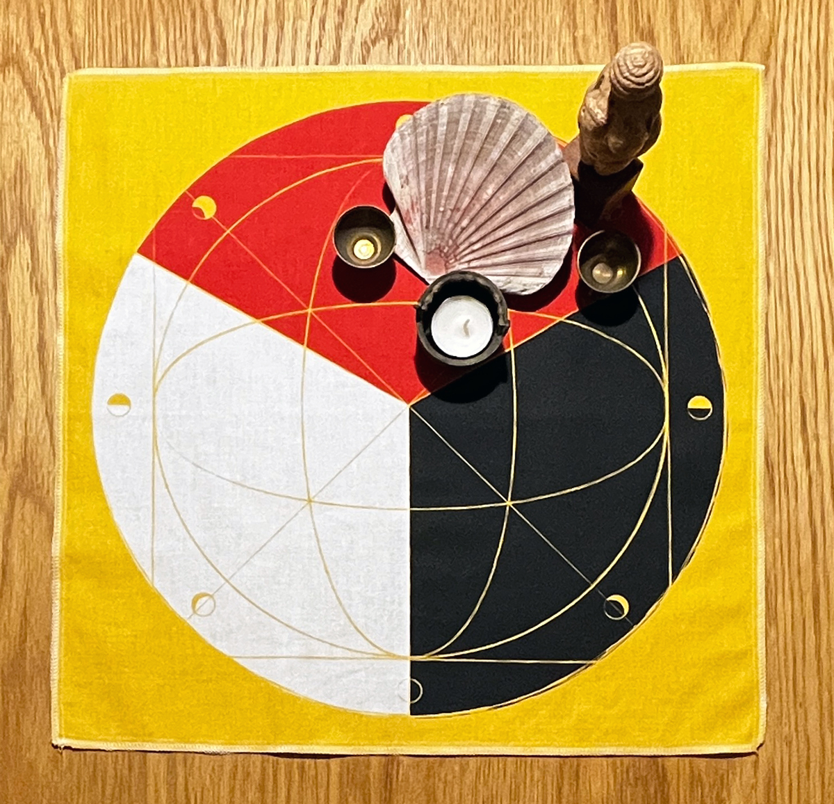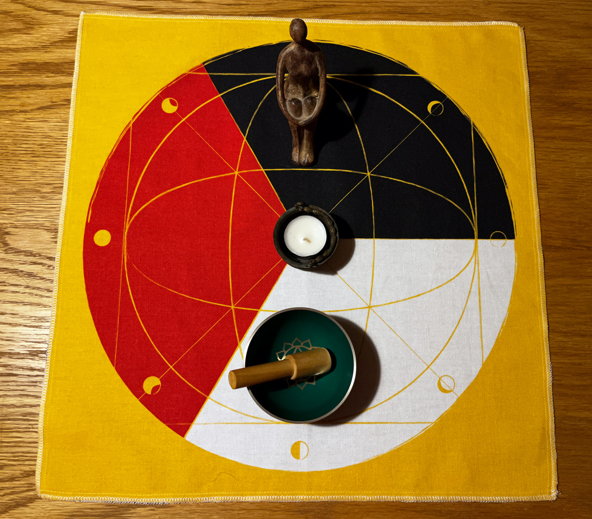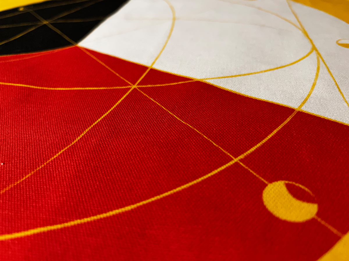 Ein Stoffquadrat aus 100% Baumwolle, in Bio-Qualität, und ca. 45x45cm groß, bedruckt mit dem Trinity/Mondzyklus-Motiv.