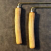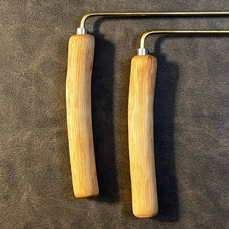 Die Griffe wurden mehrfach geschliffen und anschließend mit einem dunklen Wachs behandelt, einer Mischung aus Bienenwachs und weiteren natürlichen Bestandteilen. Diese Oberflächenbehandlung schützt das Holz, lässt seine Struktur sichtbar bleiben und sorgt für eine angenehm warme Haptik. Der Griff liegt ruhig in der Hand und ermöglicht auch bei längeren Mutungen ein konzentriertes Arbeiten.