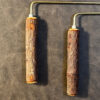 Die Griffe bestehen aus dem Holz einer alten weißen Kletterrose. Sie sind schön rund ausgeformt und liegen ausgewogen in der Hand. Die originale Rinde wurde am Holz belassen und lediglich angeschliffen. Dadurch entsteht eine glatte, zugleich griffige Oberfläche mit leicht rustikalem Charakter. Die Behandlung mit einem hellen Wachs aus Carnauba- und Bienenwachs schützt das Holz, erhält seine natürliche Anmutung und sorgt für eine klare, angenehme Haptik.